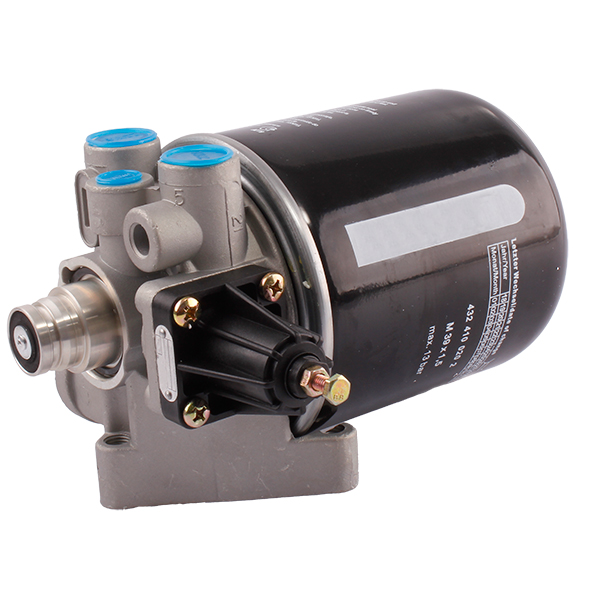 . در خودروهای سنگین، پس از تولید هوای فشرده توسط پمپ باد، نیاز است فشاری که وارد مخازن میشود بهطور دقیق کنترل شده و از برگشت باد به سمت پمپ جلوگیری گردد. سوپاپ خشککن کامل 4 پورت این وظیفه را بهخوبی انجام میدهد. این قطعه دارای پیچ تنظیم فشار در کناره خود است که امکان تنظیم فشار هوای مخزن در بازهای استاندارد را فراهم میکند. از طرفی، فیلتر خشککن وظیفه جذب رطوبت و ذرات حاصل از فشردهسازی هوا توسط پمپ باد را بر عهده دارد؛ عاملی مهم در افزایش طول عمر قطعات سیستم پنوماتیک خودرو.